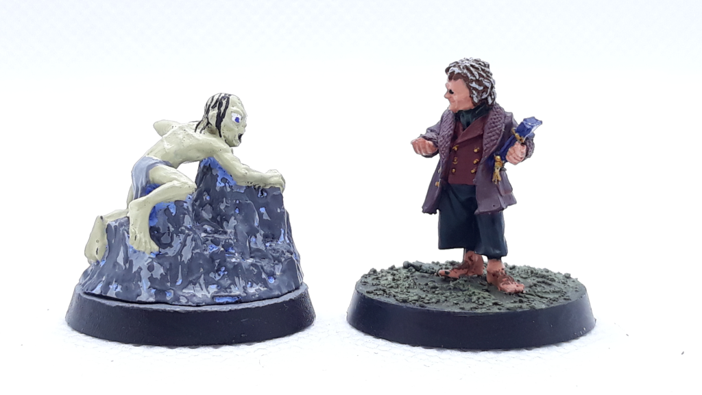 „Tief unten dort an dem dunklen Wasser lebte der alte Gollum, ein kleines, schleimiges Geschöpf“.Es beginnt eine Rätselrunde um Leben und Tod zwischen den beiden. Verliert Bilbo, zahlt er mit seinem Leben. Doch Gollum ist es, der das Rätsel des Hobbit nicht lösen kann und seine Niederlage nicht akzeptieren will. Die Jagd beginnt, diesmal ist Bilbo unerwarteterweise im Vorteil: der gefundene Ring macht ihn unsichtbar. Er kann dem wütenden Gollum und den Orks entkommen, und findet einen Weg aus dem Stollenlabyrinth.